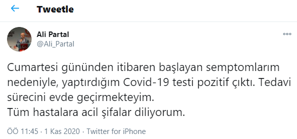 Kaymakam Ali Partal, " Cumartesi gününden itibaren başlayan semptomlarım nedeniyle, yaptırdığım Covid-19 testi pozitif çıktı. Tedavi sürecini evde geçirmekteyim. Tüm hastalara acil şifalar diliyorum" dedi.