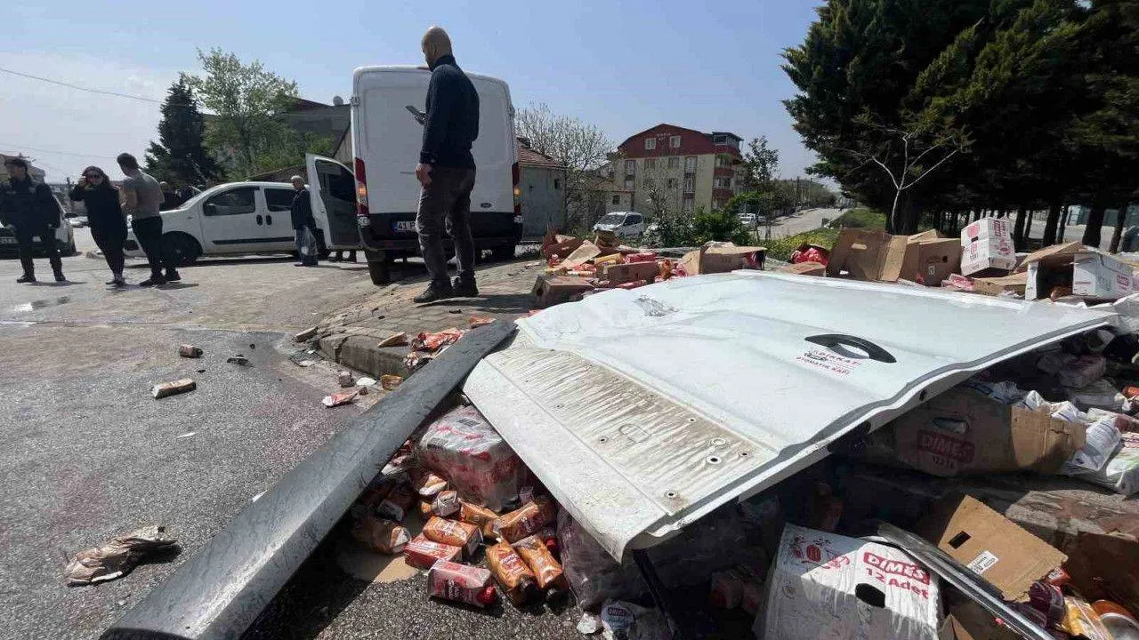 Kocaeli’nin Derince ilçesinde hafif ticari araç ile çarpışan panelvanın içinde bulunan meşrubatlar yola saçıldı, bir kişi ise yaralandı.