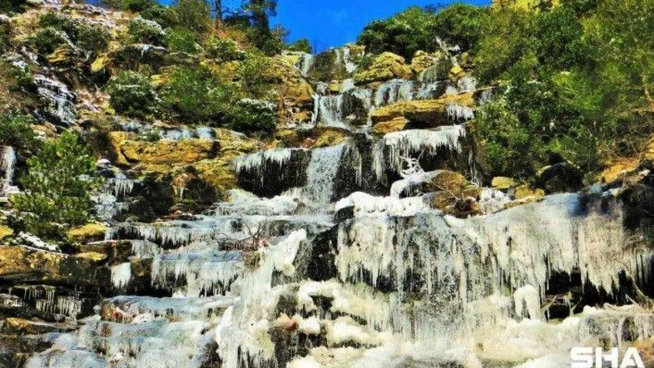 Balıkesir'in Edremit ilçesinde Kazdağları'nın yüksek kesimlerinde bulunan şelaleler soğuk hava sebebiyle buz tuttu.