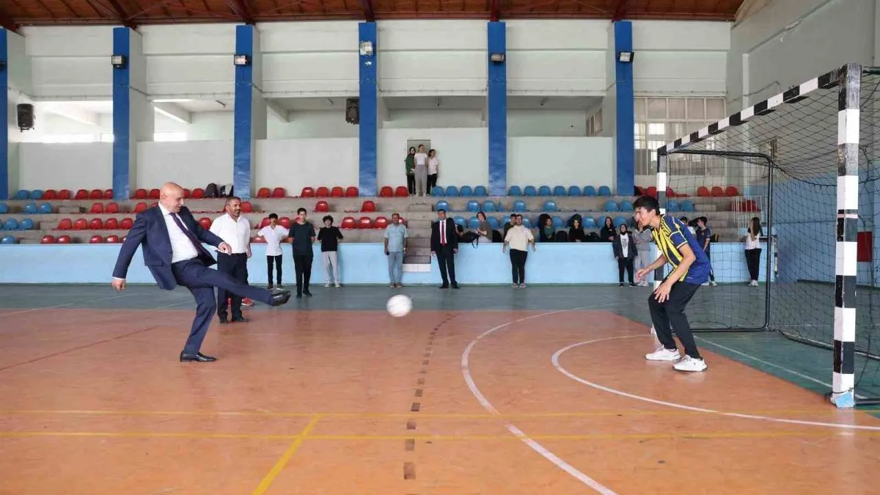 Altınok öğretmenlerle hatıra fotoğrafı çektirdi, sonrasında da öğrencilere penaltı atışı yaptı.