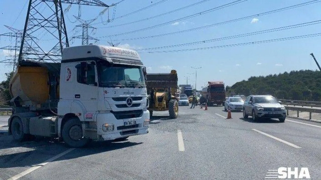 Kemerburgaz yolunda mıcır yüklü kamyon devrildi