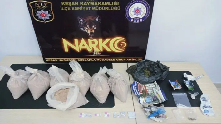 Keşan’da uyuşturucu madde ile mücadelesini sürdüren Keşan İlçe Emniyet Müdürlüğü Narkotik Suçlarla Mücadele Grup Amirliği ekipleri, Yenimescit Mahallesi üzerindeki bir adrese baskın yaptı. U.K. ve Ö.K. isimli şahıslara ait olan evde yapılan aramalarda, 7 ayrı poşet içinde 6 kilo 400 gram eroin maddesi, 15.53 gr esrar maddesi, 8.58 gram metamfetamin, 7.21 gram kenevir tohumu, 1 adet kağıda sarılı 5.23 gr. esrar, 1 adet kağıda sarılı 0.72 gr. esrar, 11 adet sentetik ecza ve uyuşturucudan elde edildiği düşünülen 9 bin 625 lira para ele geçirildi.