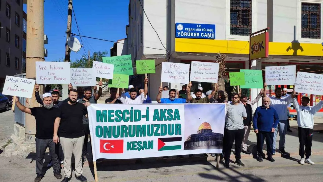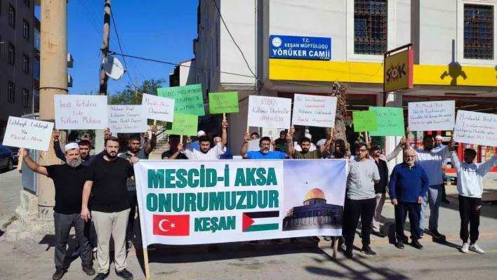 Yörüker Camii önünde toplanan cemaat, İsrail’in Filistin’e yaptığı saldırıları protesto etti. Cami cemaati adına basın açıklaması yapan Nizamettin Tezmen, "Bugün burada konuşacaklarımız belki de hemen hemen herkesin bildiği ve yüreğinde bir yara olarak taşıdığı meselelerdir. Bizlerin burada seslenişe geçişimizin asıl gayesi, eyleme geçme isteğimizdir. Çünkü bugün, Türk milleti taşına altına elini koymazsa orta doğuda herkesin gözlerinin önünde devam eden insanlık dışı katil, eli kanlı terör devletini eli kolu bağlı bir şekilde tüm dünya izleyecek. Çünkü Filistin’de umutlu gözlerle beklenen halk şanlı Türk milletidir. Buradan umutlu gözlerle bizden destek bekleyen ümmetin onuru, ilk kıblemiz Mescid’i Aksa’nın şerefli bekçileri, Allah için cihad eden Filistinli din kardeşim, korkma, üzülme, paniğe kapılma Allah bizimle beraberdir. Kafirler, ağızlarıyla Allah’ın nurunu söndürmek istiyor. Halbuki kafirler istemese de Allah nurunu tamamlayacaktır. Ey İsrail; şuanda ufacık bir yere sığdıramadığın Filistin ile savaşıyorsun. Bizler Müslümanlar olarak son sözümüzü söylemedik. Bu zamana kadar dualar ile manen yanında olduğumuz Filistin’in devletimizin de desteği ile silahlanarak ilk kıblemiz Mescid-i Aksa için seve seve Allah uğrunda seve seve şehit olmaya Keşan olarak biz de varız. Bu memleketin ne Nene Hatunları, ne de Seyit Onbaşı’ları biter. Gerekirse bir ölürüz ama küllerimizden bin diriliriz. Onlar ne yaparsa yapsın Allah nurunu tamamlayacaktır" dedi. Açıklamanın ardından, Yörüker Cami İmam Hatibi Mustafa Kabakçılı tarafından, İsrail’in saldırıları sonucu hayatlarını kaybeden Filistinliler için gıyabi cenaze namazı kıldırıldı. Namazın ardından Filistin’de hayatlarını kaybedenlere dua edildi.