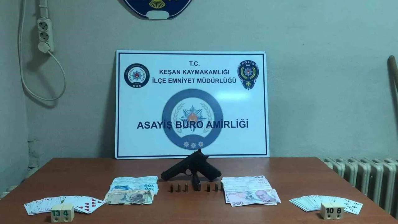 Alınan bilgiye göre, Keşan ilçesi Zaferiye Mahallesi Efes Yolu üzerindeki bir işyerinde kumar oynatıldığı bilgisi alan polis ekipleri, belirtilen adrese baskın yaptı. Yarı açık olan kapıda U.K’nin beklediğini gören polis, içeride yaptığı incelemede, 10 şüphelinin kumar oynadığını belirledi. Polis ekipleri, masa üzerinde 18 bin 825 TL ile kumar oynamada kullanıldığı belirlenen okey taşı ve iskambil kağıtları ele geçirdi. Dolap içerisinde ruhsatsız tabanca ile tabancaya ait şarjör ve fişekler ele geçirilen baskında şüpheliler hakkında adli işlem başlatıldı.