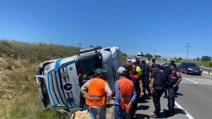 Edirne'nin Keşan ilçesinde meydana gelen trafik kazasında, yoldan çıkarak yan yatan tırın sürücüsü hayatını kaybetti.