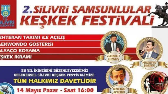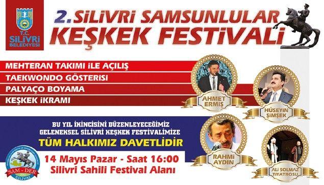 Bu yıl ikincisi düzenlenecek olan "Silivri Samsunlular Keşkek Festivali", 14 Mayıs Pazar günü, birbirinden güzel etkinliklerle Silivri Sahili Festival Alanında gerçekleşecek. Keşkek Festivali'ni geleneksel hale getirmek için uğraş sarf eden Dernek Yönetiminin bu yıl ikincisini gerçekleştirecekleri festival, görkemli bir törenle açılacak.