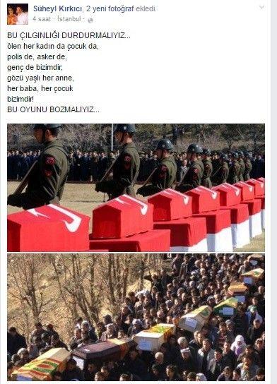 Fakat ilçemizdeki CHP'li meclis üyesi biri "sanki devletimiz tarafından yıllardan beridir çözüm adı altında hiç bir şey yapılmamış ve denenmemiş gibi, aşağıdaki yorumu sosyal medyada paylaşarak altına da Türk şehit cenazelerinin ve PKK militanlarının sempatizanlarının cenazelerinin bulunduğu fotoyu koymuştur. Ancak, kendisine buradan sormadan edemeyeceğim; Yukarıdaki yakarış ve temenni cümlelerinin içinde, yıllardır bu millete çektiren PKK Terör Örgütüne ait neden hiçbir eleştiri ibaresi yok?? Şimdi, herkes "tabiri caiz ise şapkasını önüne alıp düşünmeli" ve bu saatten sonra vatanımıza ve milletimize mermi atanlara "çiçek atamayacağımızı" anlamalıdır! Atatürk'ümüzün dediği , "Söz konusu vatan ise gerisi teferruattır" sözünü Sn. CHP'li Meclis Üyesi arkadaşa hatırlatmak isterim. Devletimiz tarafından uzun yıllardır sunulmuş olan ve hatta gösterilen her türlü ortak çözüm çabalarına rağmen, kimse gocunmasın ama"Bize kurşun atanlara Biz çiçek atamayız". Devletimiz bu terör gruplarını temizlemek için ne gerekiyorsa her zaman gerekeni yapacaktır ve yapmalıdır da!"
