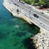 Korona virüs tedbirleri kapsamında uygulanan sokağa çıkma kısıtlamasının olduğu pazar günü, Üsküdar sahile akın eden gençler serinlemek için denize girdi. Denize giren gençler havadan görüntülendi.