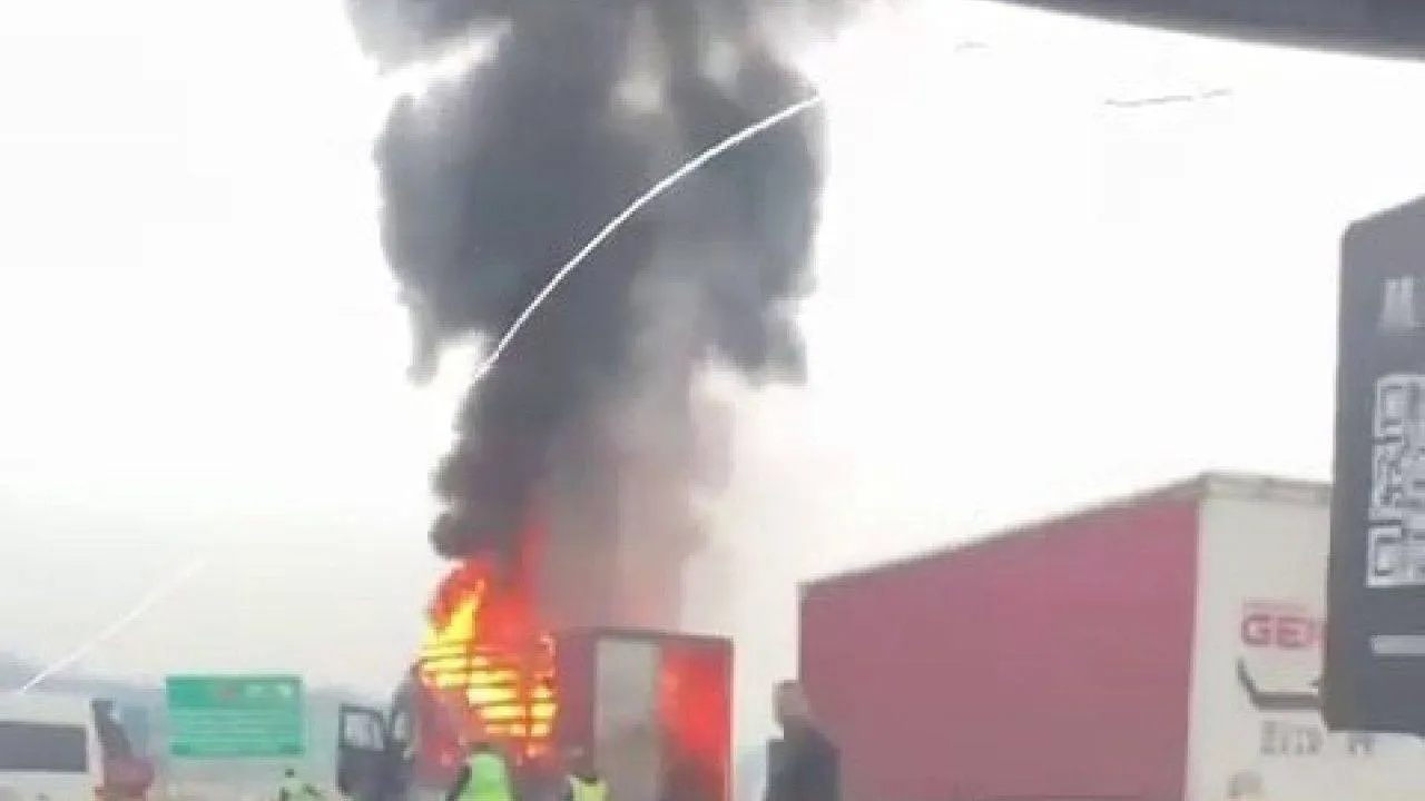 Kuzey Marmara Otoyolu'nun Sakarya kesiminde seyir halindeyken alev alan mutfak malzemeleri yüklü tır, itfaiye ekiplerinin müdahalesi sonrasında söndürüldü. Tırın alev aldığı anlar cep telefonu kamerasına yansırken, taşıdığı malzemeler ise küle döndü.