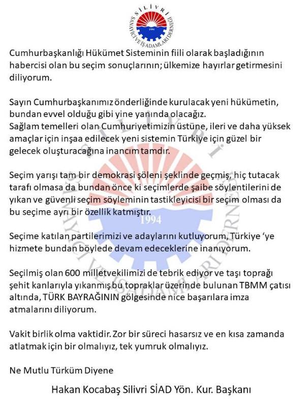 27. Dönem Milletvekilliği ve Cumhurbaşkanlığı seçimleri ile alakalı olarak Silivri SİAD yazılı bir açıklamada bulundu. Mesajda ” Cumhurbaşkanımızın önderliğinde kurulacak hükumetimizin yanındayız.” şeklinde  yazılı açıklama yapıldı.