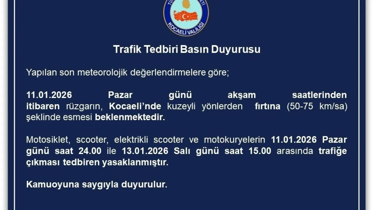 Kocaeli Valiliği tarafından yapılan açıklamada, "Yapılan son meteorolojik değerlendirmelere göre; 11.01.2026 Pazar günü akşam saatlerinden itibaren rüzgarın, Kocaeli’nde kuzeyli yönlerden fırtına (50-75 km/sa) şeklinde esmesi beklenmektedir. Motosiklet, scooter, elektrikli scooter ve motokuryelerin 11.01.2026 Pazar günü saat 24.00 ile 13.01.2026 Salı günü saat 15.00 arasında trafiğe çıkması tedbiren yasaklanmıştır. Kamuoyuna saygıyla duyurulur" ifadelerine yer verildi.