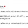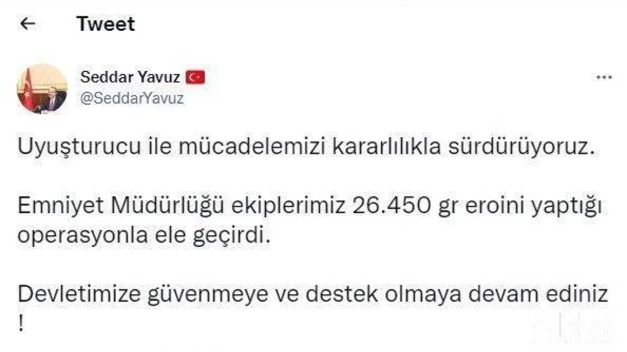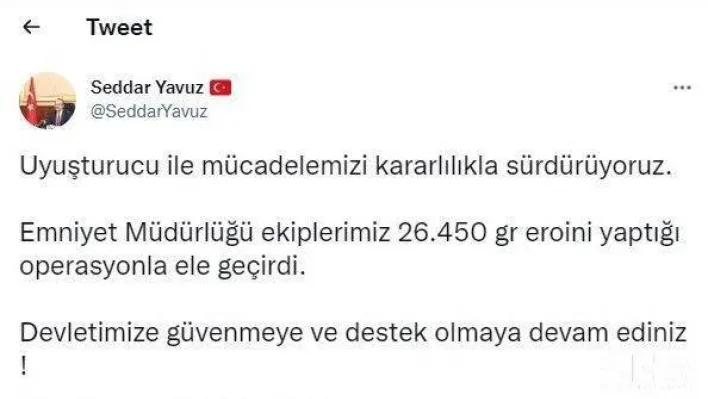 Vali Seddar Yavuz, sosyal medya hesabından yaptığı açıklamada, "Uyuşturucu ile mücadelemizi kararlılıkla sürdürüyoruz. Emniyet müdürlüğü ekiplerimiz 26 kilo 450 gram eroini yaptığı operasyonla ele geçirdi. Devletimize güvenmeye ve destek olmaya devam ediniz" ifadelerini kullandı.