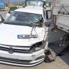 Kontrolden çıkan otomobil benzinlikteki tıra çarptı