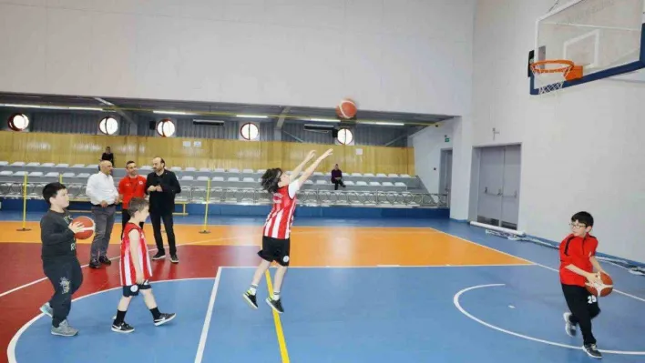 Körfez Belediyesi Spor Akademileri'nde basketbol eğitimi alan genç yetenekler, antrenmanlarda hünerlerini sergiliyor.