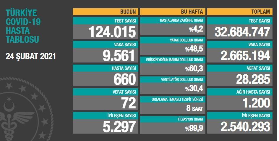 Sağlık Bakanlığının Covid-19 bilgilendirme sayfasında Türkiye'nin güncel korona virüs tablosu kamuoyuyla paylaşıldı. Tabloya göre son 24 saatte 72 kişi korona virüsten hayatını kaybetti, toplam can kaybı 28 bin 285'e yükseldi. Toplamda 32 milyon 584 bin 747 test yapıldı. Bugün yapılan 124 bin 15 testten, 9 bin 561 yeni vaka sayısı, 660 de yeni hasta sayısı olduğu belirtildi. Toplam vaka sayısının 2 milyon 665 bin 194 olduğu, bugün iyileşen 5 bin 297 kişiyle birlikte toplam iyileşen hasta sayısının 2 milyon 540 bin 293'e yükseldiği, toplam hastalarda zatürre oranının yüzde 4,2, ağır hasta sayısının ise bin 200 olduğu açıklandı.