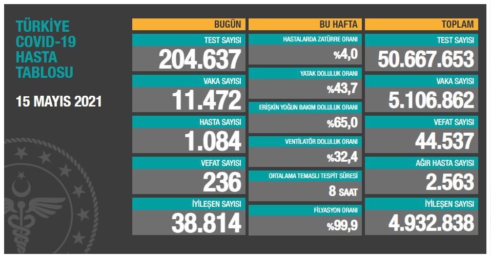 Sağlık Bakanlığının Covid-19 bilgilendirme sayfasında Türkiye'nin güncel korona virüs tablosu kamuoyuyla paylaşıldı. Tabloya göre son 24 saatte 236 kişi korona virüsten hayatını kaybetti, toplam can kaybı 44 bin 537'e yükseldi. Toplamda 50 milyon 667 bin 653 test yapıldı. Bugün yapılan 204 bin 637 testten, 11 bin 472 yeni vaka sayısı, 1 bin 084 kişi de yeni hasta sayısı olduğu belirtildi.