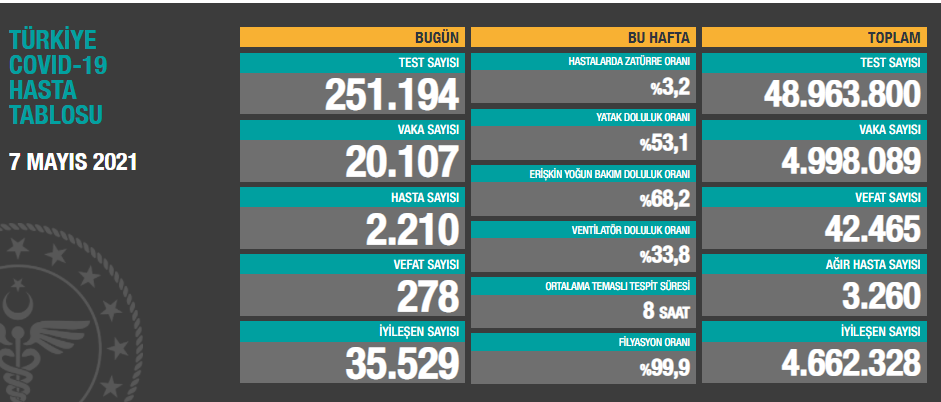 Toplamda 48 milyon 963 bin 800 test yapıldı. Bugün yapılan 251 bin 194 testten, 20 bin 107 yeni vaka sayısı, 2 bin 210 kişi de yeni hasta sayısı olduğu belirtildi. Toplam vaka sayısının 4 milyon 998 bin 89 olduğu, bugün iyileşen 35 bin 529 kişiyle birlikte toplam iyileşen hasta sayısının 4 milyon 662 bin 328'e yükseldiği, toplam hastalarda zatürre oranının yüzde 3,2, ağır hasta sayısının ise 3 bin 260 olduğu açıklandı.