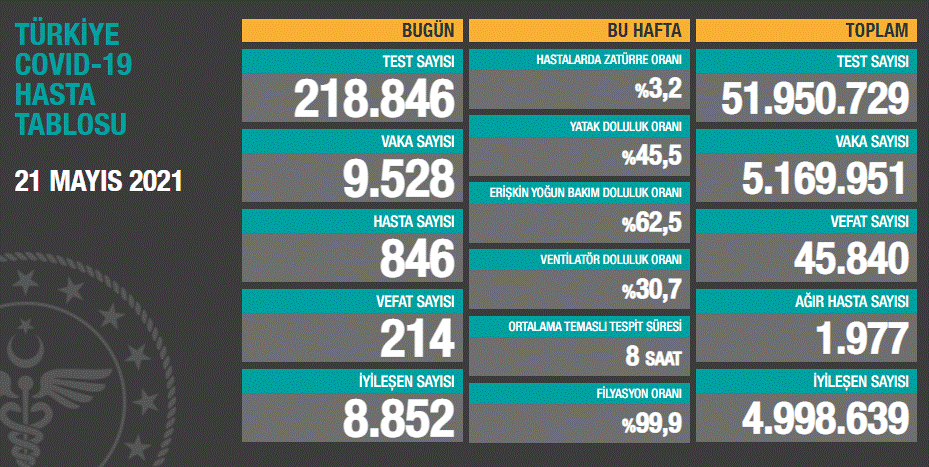 Türkiye'de son 24 saatte 9.528 koronavirüs vakası tespit edildi. 214 kişi hayatını kaybetti