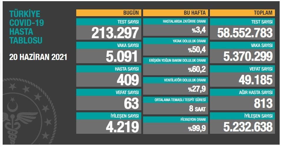 Tabloya göre son 24 saatte 63 kişi korona virüsten hayatını kaybetti, toplam can kaybı 49 bin 185'e yükseldi. Toplamda 58 milyon 552 bin 783 test yapıldı. Bugün yapılan 213 bin 297 testten 5 bin 91 yeni vaka sayısı, 409 da yeni hasta sayısı olduğu belirtildi. Toplam vaka sayısının 5 milyon 370 bin 299, bugün iyileşen 4 bin 219 kişiyle toplam iyileşen hasta sayısının 5 milyon 232 bin 638'e yükseldiği, toplam hastalarda zatürre oranının yüzde 3,4, ağır hasta sayısının ise 813 olduğu açıklandı.