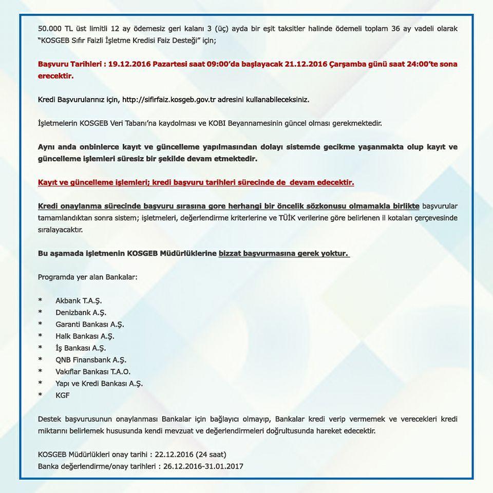 KOSGEB'in 15 bin KOBİ'ye sunulacak 50 bin liralık "Sıfır Faizli İşletme Kredisi Faiz Desteği" için bugün saat 09.00 ile 21 Aralık Çarşamba günü saat 23.59 aralığında, "http://sifirfaiz.kosgeb.gov.tr" adresinden başvuru yapılabilecek.