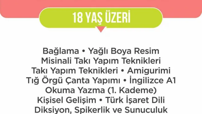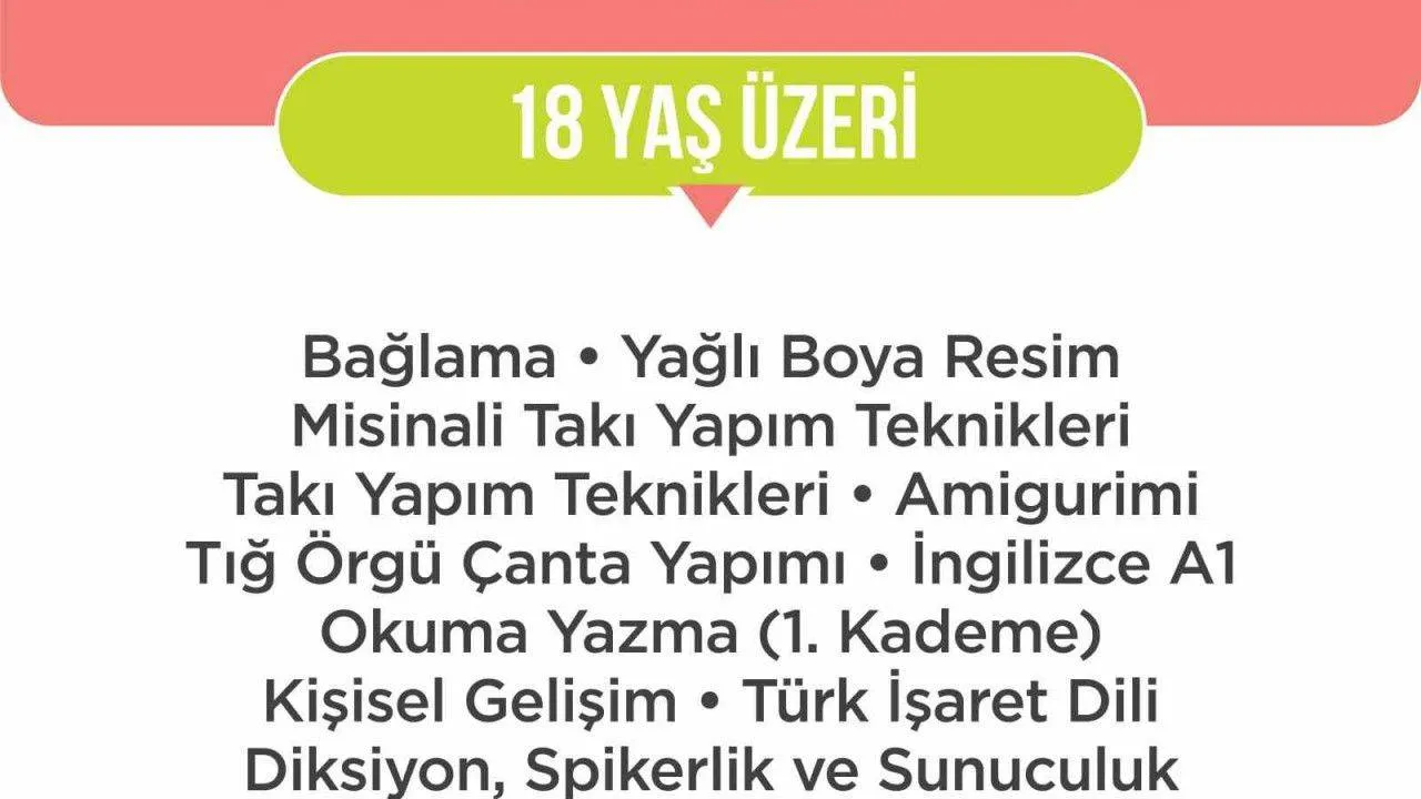 Kurslarda yetişkinlere yönelik; bağlama, tambur, yağlı boya resim, takı yapım teknikleri, İngilizce A1, Almanca A1, bilgisayar işletmenliği ofis programları, okuma yazma, aşçı çırağı ve kişisel gelişim branşlarında; 8-17 yaş aralığındaki öğrencilere ise alanında uzman eğitmenler tarafından piyano, bağlama, gitar, yaratıcı drama, Türk işaret dili, görsel sanatlar atölyesi, resim sanatı eğitimi, P4C (çocuklara felsefe), mutfak atölyesi ve satranç gibi alanlarda eğitimler verilecek.