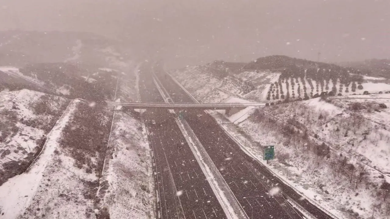 İstanbul Kuzey Marmara Otoyolu Fener Tepe Mevkii’nde kar yağışı havadan dron ile görüntülendi. Görüntülerde lapa lapa kar yağdığı görülüyor.