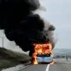 Kuzey Marmara Otoyolu Silivri mevkiinde motor kısmından tutuşan tur otobüsü alev alev yandı. Sürücünün yangını fark edip yolcuları otobüsten indirmesi olası bir faciayı önledi.