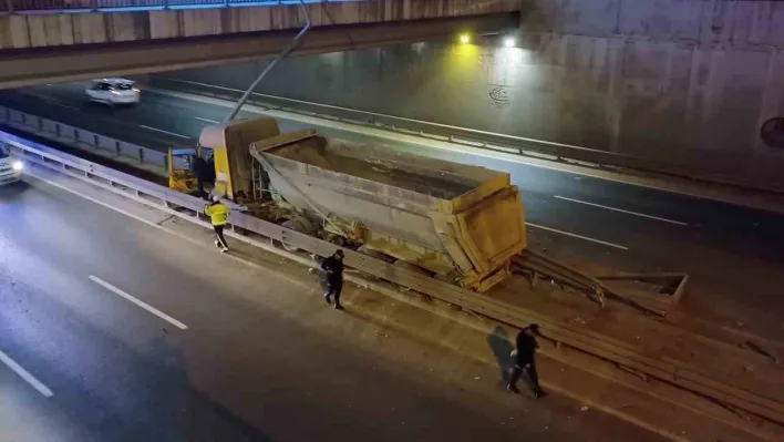 Kocaeli'nin Gebze ilçesinde seyir halindeyken lastiği patlayan hafriyat kamyonu, önce bariyerlere çarpıp ardından tünel girişindeki refüje çıktı. Şans eseri kazaya başka araç karışmazken kamyon karşı şeride geçmekten son anda kurtuldu.