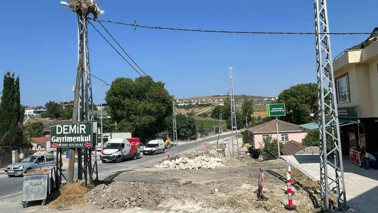İstanbul Büyükşehir Belediyesi ve Büyükçekmece Belediyesi işbirliğiyle sürdürülen yol genişletme ve yenileme çalışması, leylek yavruları büyüyüp yuvayı terk etmelerinin ardından devam edecek.