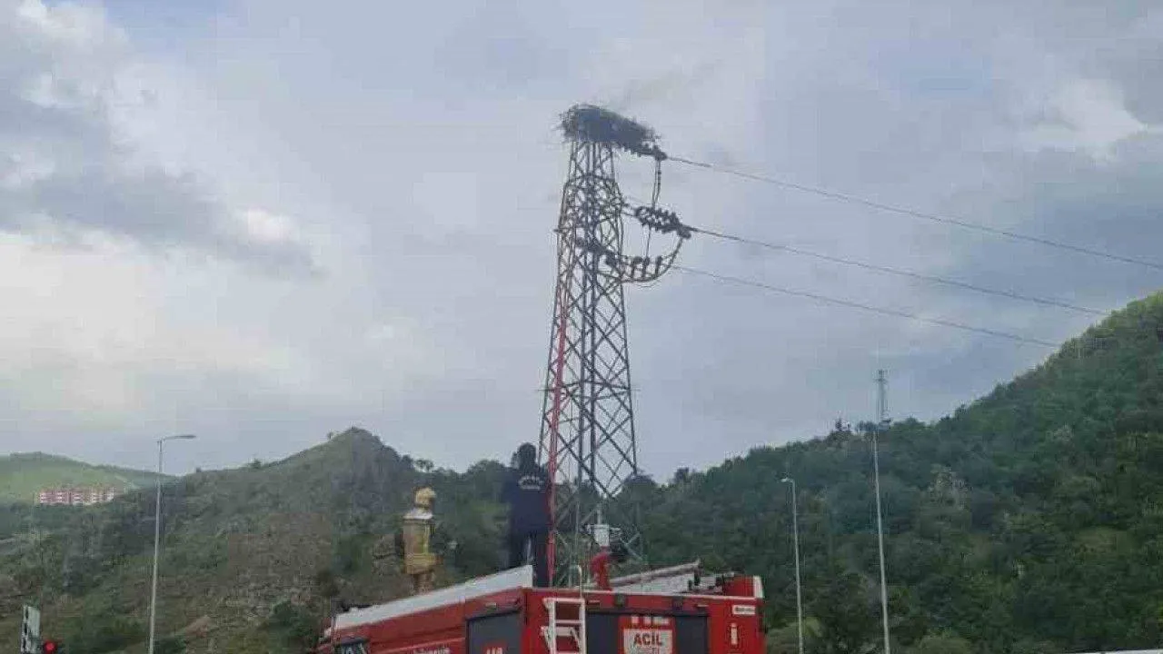 Kızılcahamam Sanayi girişinde elektrik direği üzerinde bulunan leylek yuvasına yıldırım düştü.