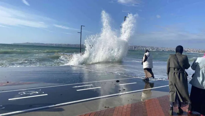 İstanbul’da lodos etkisini sürdürürken Büyükçekmece’de bazı vatandaşlar denizden çıkan dev dalgalarla fotoğraf çekinmek için ıslanmayı göze aldı.