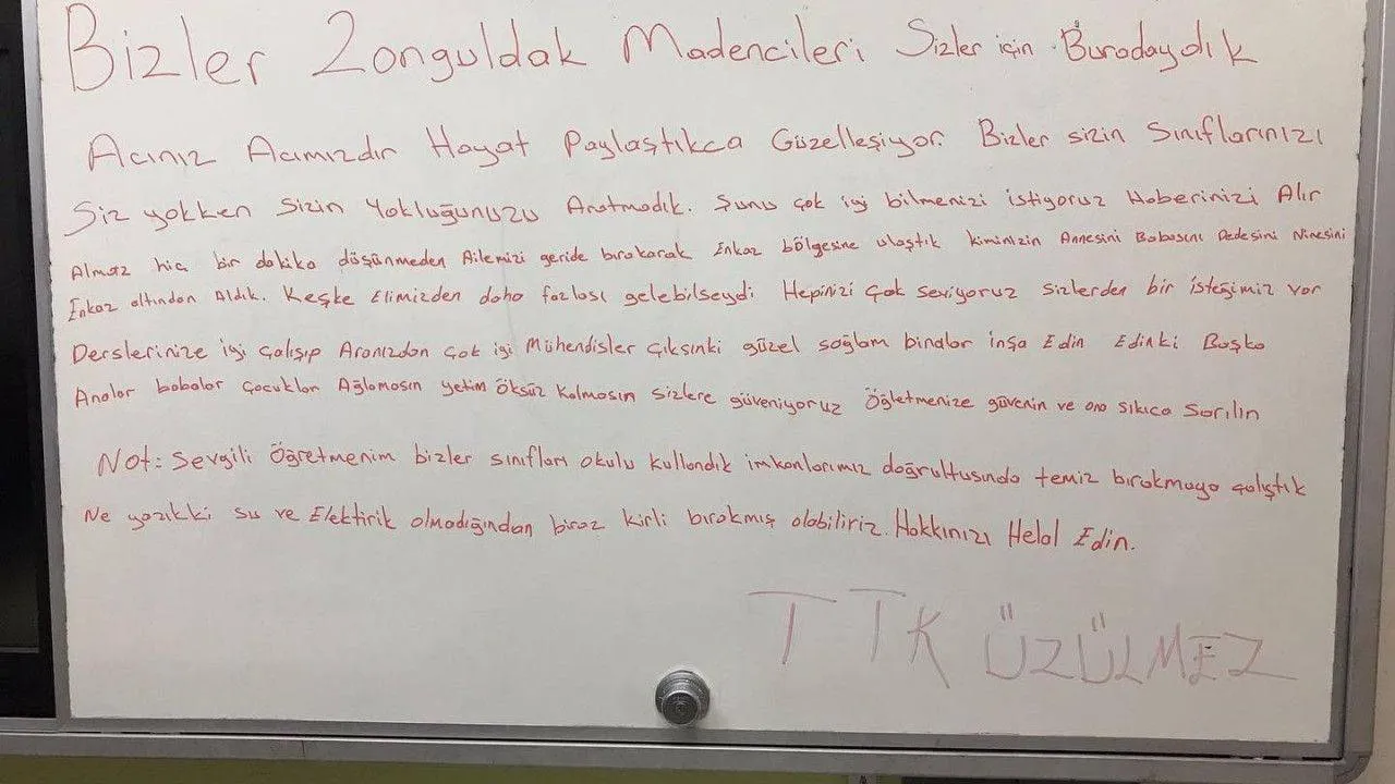 Kahramanmaraş merkezli 10 ilde büyük yıkıma neden olan depremler sonrası enkaz altındakileri kurtarmak için TTK Madenci ekipleri adeta zamanla yarıştı. Madenciler, sürünerek girdikleri enkaz altından can kurtarmaya devam ederken dinlenmek için kaldıkları okulun sınıfındaki tahtaya yazı yazdılar ve helallik istediler. Depremzedelerin kahramanı olan madencilerin yazı tahtasına bıraktıkları mesaj şu şekilde: