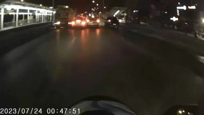İnsanın içini ürperten olay, merkez Nilüfer ilçesi İzmir Yolu Caddesi üzerinde meydana geldi. Süratle seyreden otomobil sürücüsü aniden şerit değiştirip makas atmak istedi. Bu esnada yol kenarında bakım çalışması yapan sulama tankerini çarpmaktan son anda yaptığı manevrayla kurtulan sürücü yürekleri ağıza getirdi. Facianın eşiğinden dönen sürücünün o anları aynı istikamette seyreden motosiklet sürücüsünün kas kamerasına anbean yansıdı.