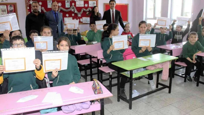 Manyas Kaymakamı Koray Çelik yarıyıl tatilinin başlaması nedeniyle karne dağıtım törenine katıldı. Karnelerini alan öğrencilerin sevinci görülmeye değerdi.