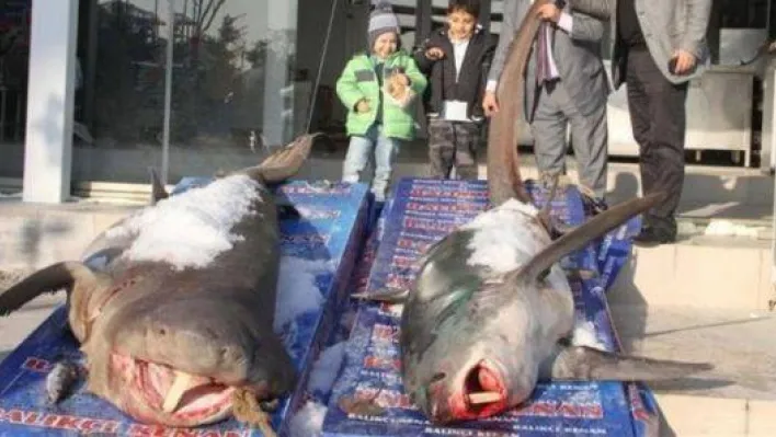 Beylikdüzü açıklarında 4.5 metrelik iki köpek balığı yakalandı. Sergilenen köpek balıklarını gören vatandaşlar şaşkınlıklarını gizleyemedi.