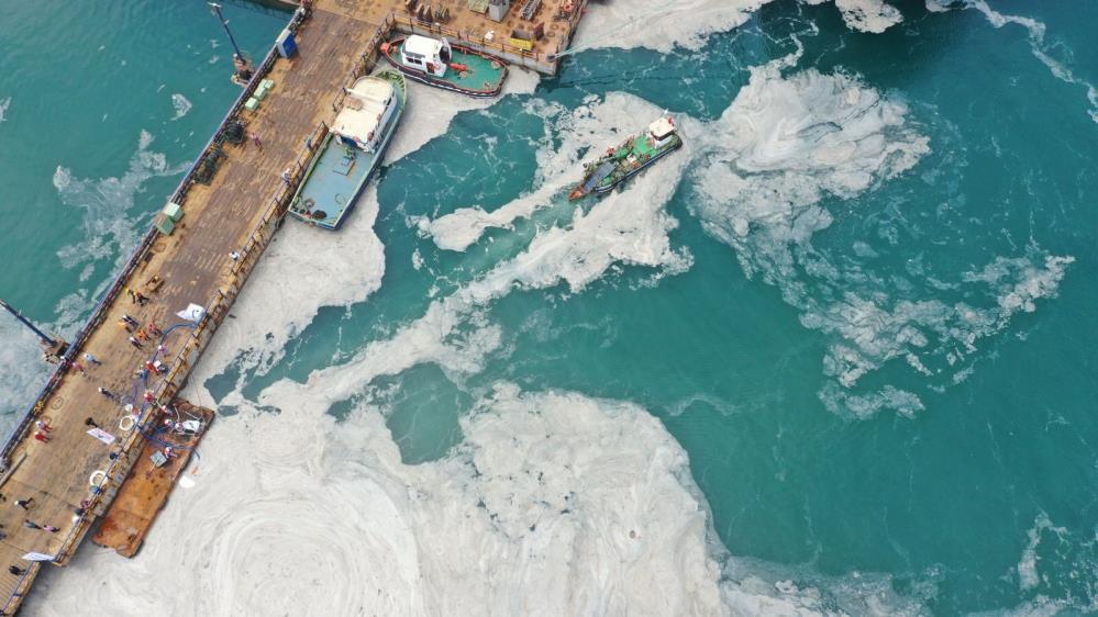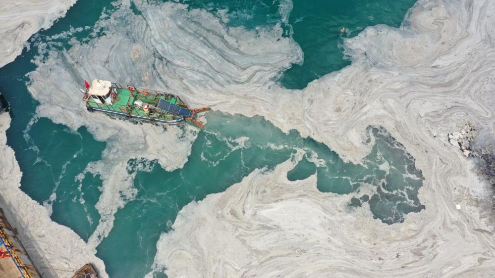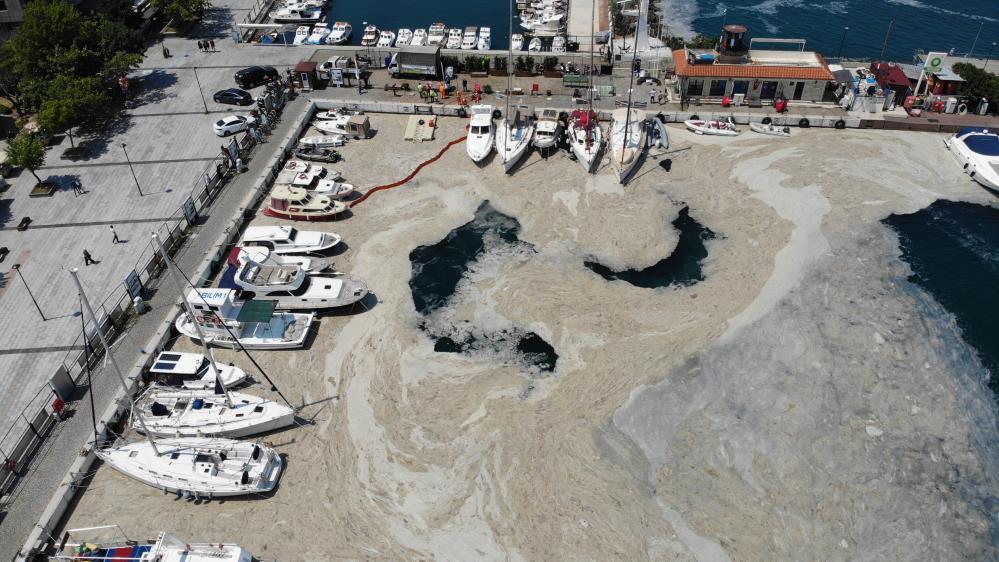 Marmara Denizi'nde giderek artış gösteren deniz salyalarının Caddebostan Sahili'ndeki temizlik çalışmaları ise havadan görüntülendi.