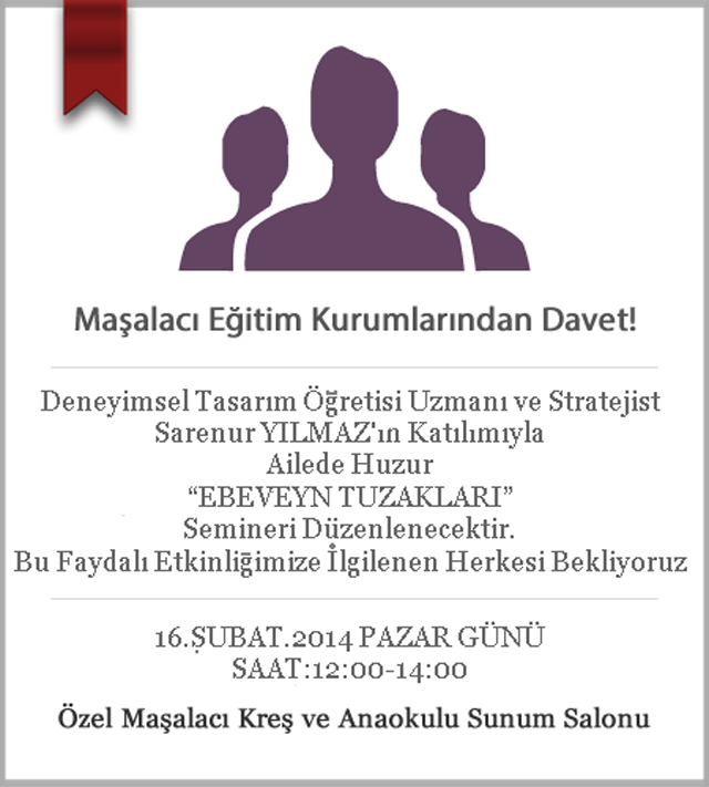 Özel Silivri Maşalacı Kreş ve Anaokulu tarafından ailelere yönelik Deneyimsel Tasarım Öğretisi ve ailede huzur semineri düzenleniyor. "Ebeveny tuzakları" adını taşıyan seminer Pazar günü Kreş binasında gerçekleştirilecek. Okul yönetimi tarafından yapılan açıklamada Seranur Yılmaz'ın konuşmacı olarak katılacağı seminerin saat 12.00 ile 14.00 arasında yapılacağı ve halka açık olacağı duyuruldu. Konuya ilgi gösteren herkesin katılım gösterebileceğini ifade eden okul yönetimi herkesi seminer programına katılıma davet etti.