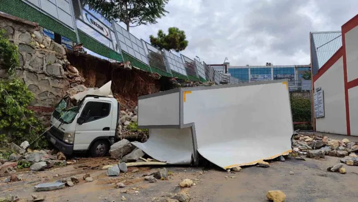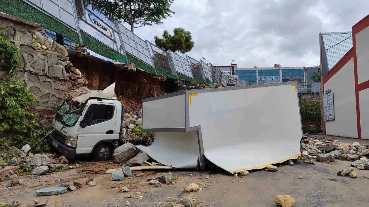 Masko Sanayi Sitesi'nde sel nedeniyle çöken istinat duvarı kamyoneti ikiye böldü