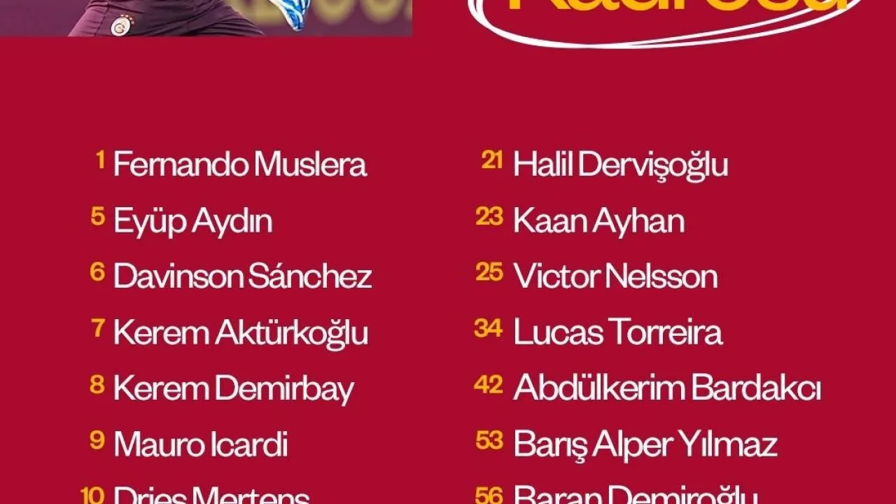 "Fernando Muslera, Eyüp Aydın, Davinson Sanchez, Kerem Aktürkoğlu, Kerem Demirbay, Mauro Icardi, Dries Mertens, Wilfried Zaha, Berkan Kutlu, Günay Güvenç, Tete, Halil Dervişoğlu, Kaan Ayhan, Victor Nelsson, Lucas Torreira, Abdülkerim Bardakcı, Barış Alper Yılmaz, Baran Demiroğlu, Kazımcan Karataş, Tanguy Ndombele ve Sacha Boey."