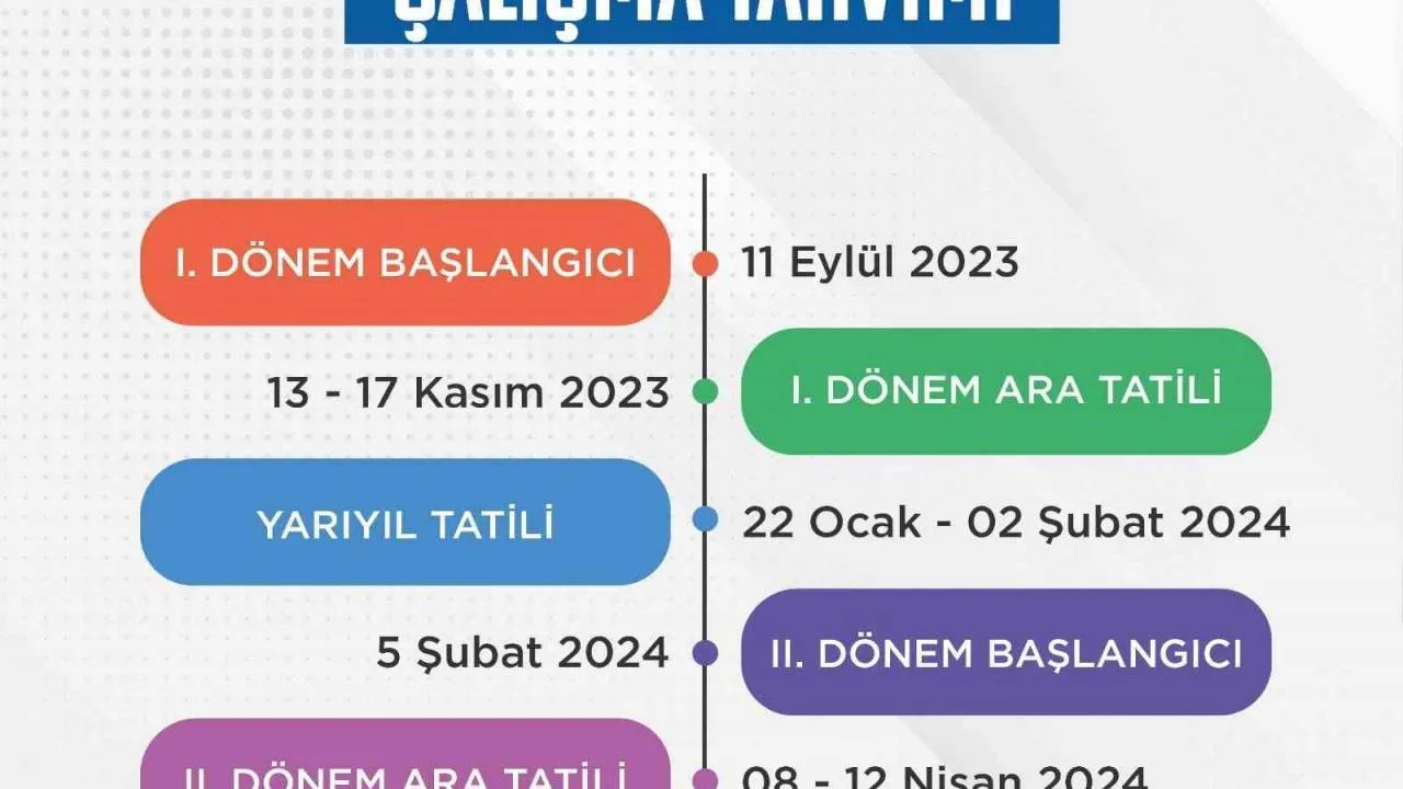 Milli Eğitim Bakanlığı, sosyal medya hesabı üzerinden yaptığı açıklamada 2023-2024 eğitim-öğretim yılı çalışma takviminde ilk ders zilinin 11 Eylül’de çalacağını ve ikinci dönemin 14 Haziran 2024 Cuma günü sona ereceğini belirtti. Ayrıca paylaşımda 2024-2025 eğitim ve öğretim yılının 9 Eylül 2024’te başlayacağı kaydedildi.