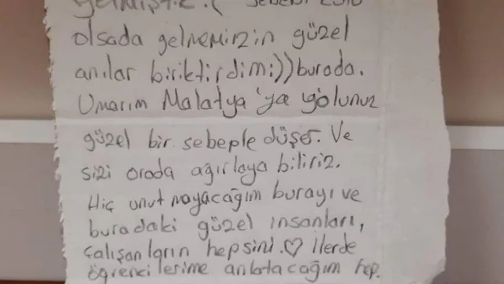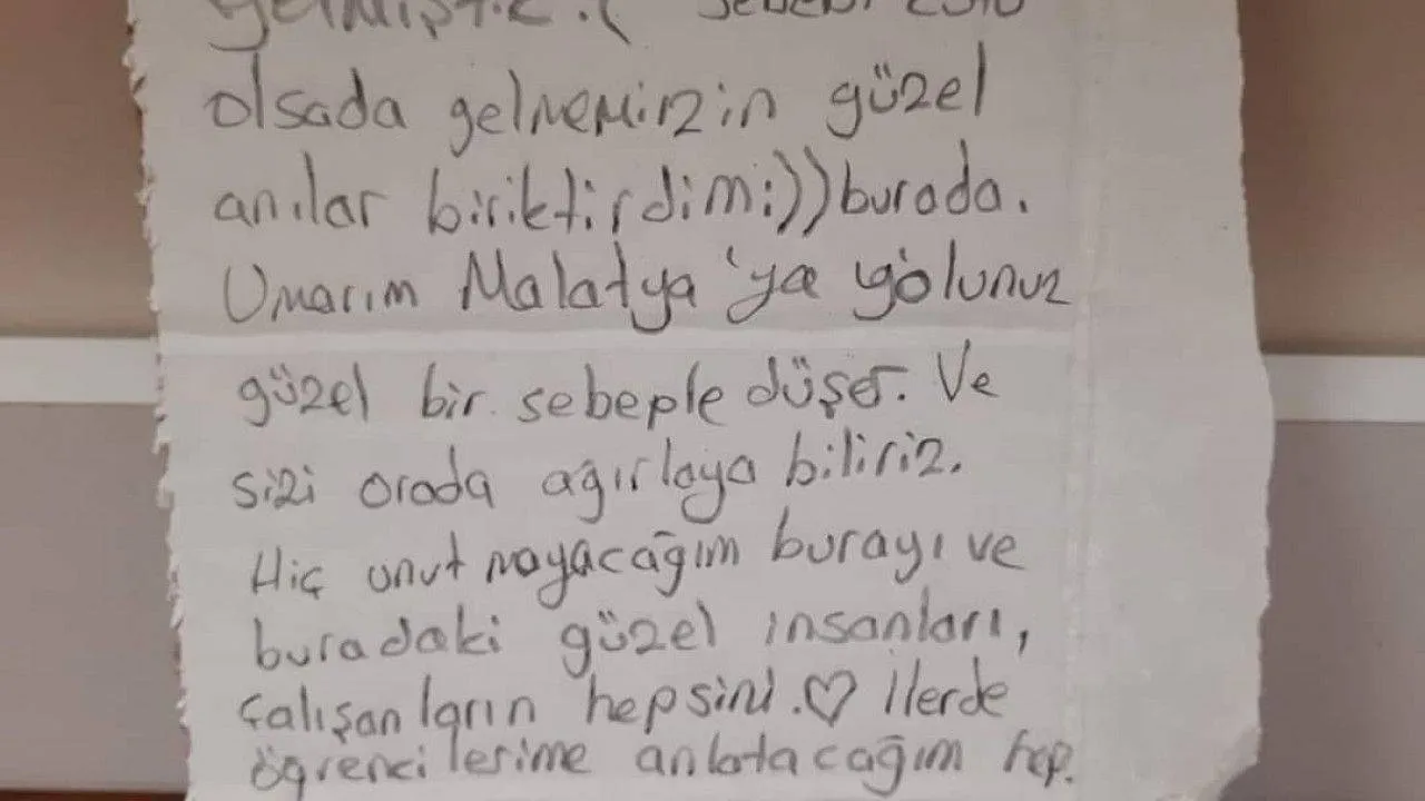 Malatyalı depremzede ayrılmadan evvel bıraktığı notta şu ifadelere yer verdi: "Merhaba. Biz Malatya’dan gelmiştik. Gelmemizin sebebi kötü olsa da güzel anılar biriktirdim burada. Umarım Malatya’ya yolunuz güzel bir sebeple düşer. Ve sizi orada ağırlayabiliriz. Burayı hiç unutmayacağım. Buradaki güzel insanları, çalışanları hepsini. İleride öğrencilerime anlatacağım. Teşekkür ederim. Emir Sultan KYK ve tüm çalışanları. Zor günlerimizde hep yanımızda oldunuz. Ve tabii ki Bursa Büyükşehir Belediyesi"