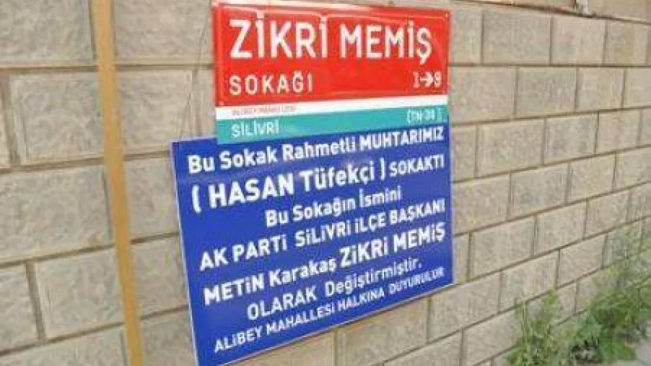 "Bu sokak rahmetli muhtarımız (Hasan Tüfekçi) sokaktı. Bu sokağın ismini AK Parti Silivri İlçe Başkanı Metin Karakaş; Zikri Memiş olarak değiştirmiştir. Alibey Mahallesi halkına duyurulur."