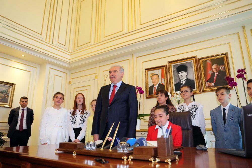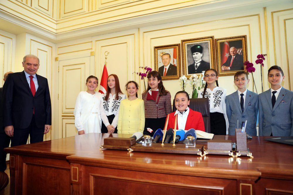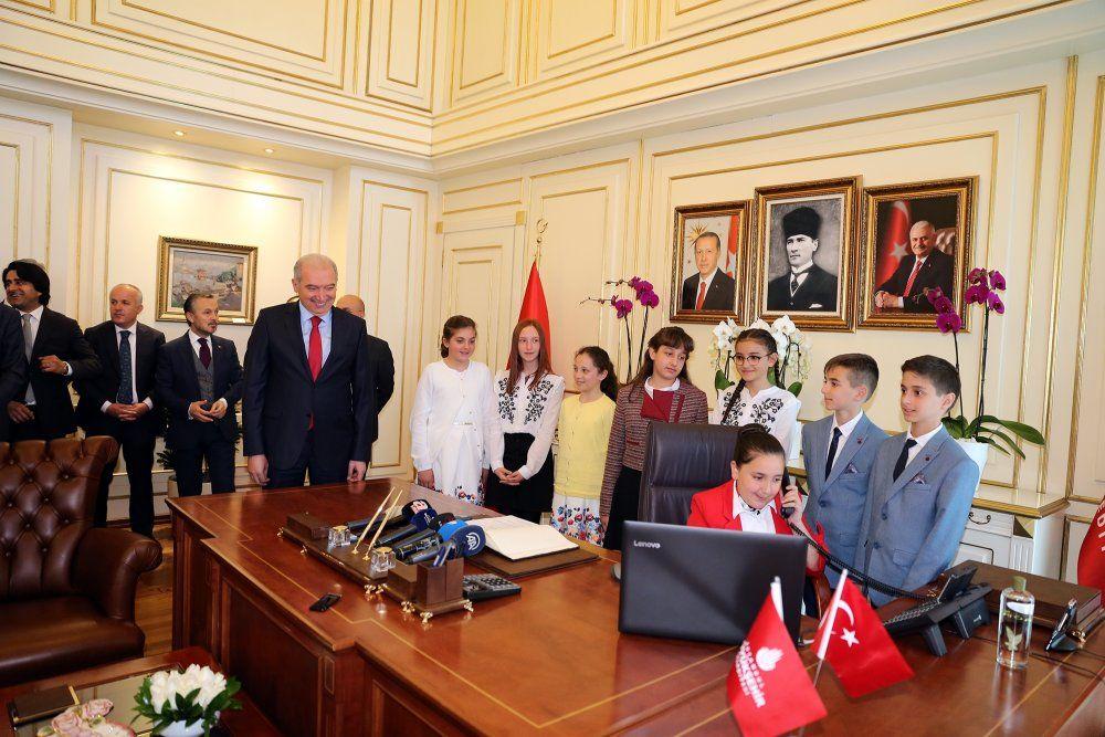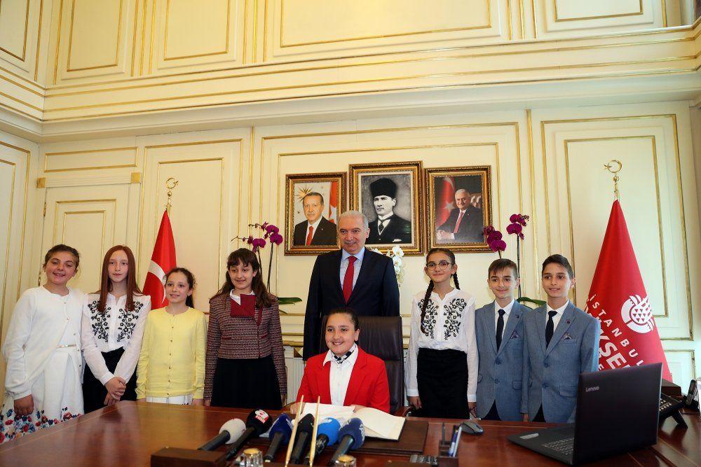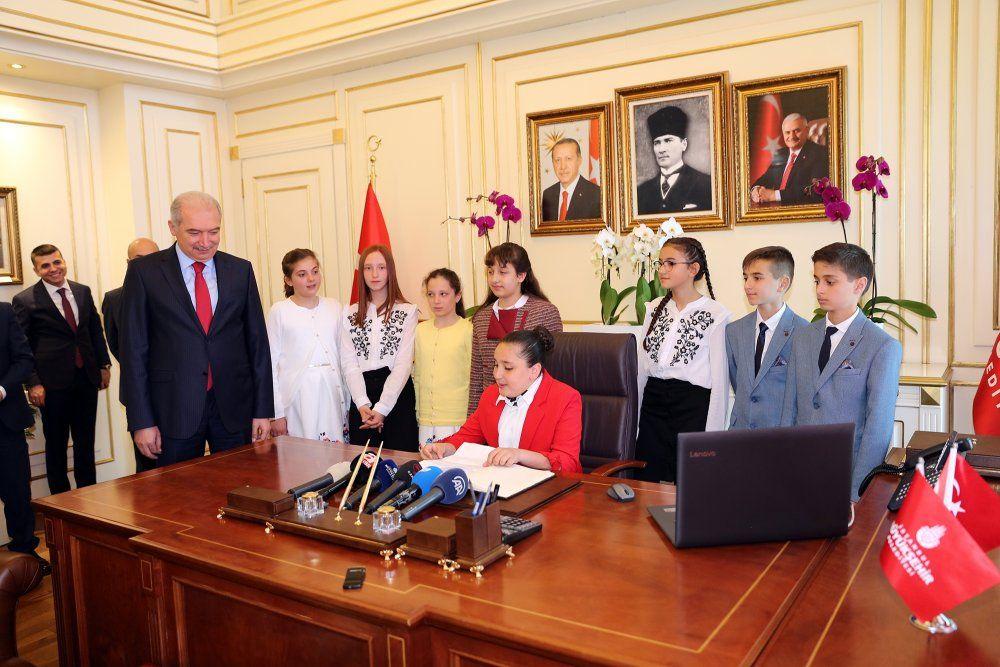 İstanbul Büyükşehir Belediye Başkanı Mevlüt Uysal, 23 Nisan Ulusal Egemenlik ve Çocuk Bayramı etkinlikleri kapsamında makam koltuğunu Silivri Beyciler Mukaddes Sönmez Ortaokulu 7. sınıf öğrencisi Yağmur Özer'e devretti.
