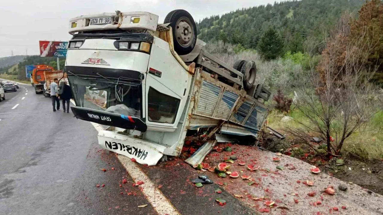 Ankara'da sürücüsünün kontrolünü kaybettiği kapuz yüklü kamyon devrildi. Kazada yaralanan olmazken, tonlarca karpuz yola saçıldı.