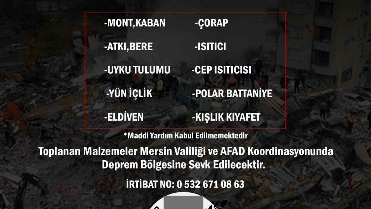 MGC merkez binasında toplanacak olan mont, kaban, atkı, bere, battaniye, eldiven, yün içlik, cep ısıtıcısı, ısıtıcı, uyku tulumu gibi malzemeler Mersin Valiliği ve AFAD koordinasyonunda deprem bölgesine sevk edilecek.