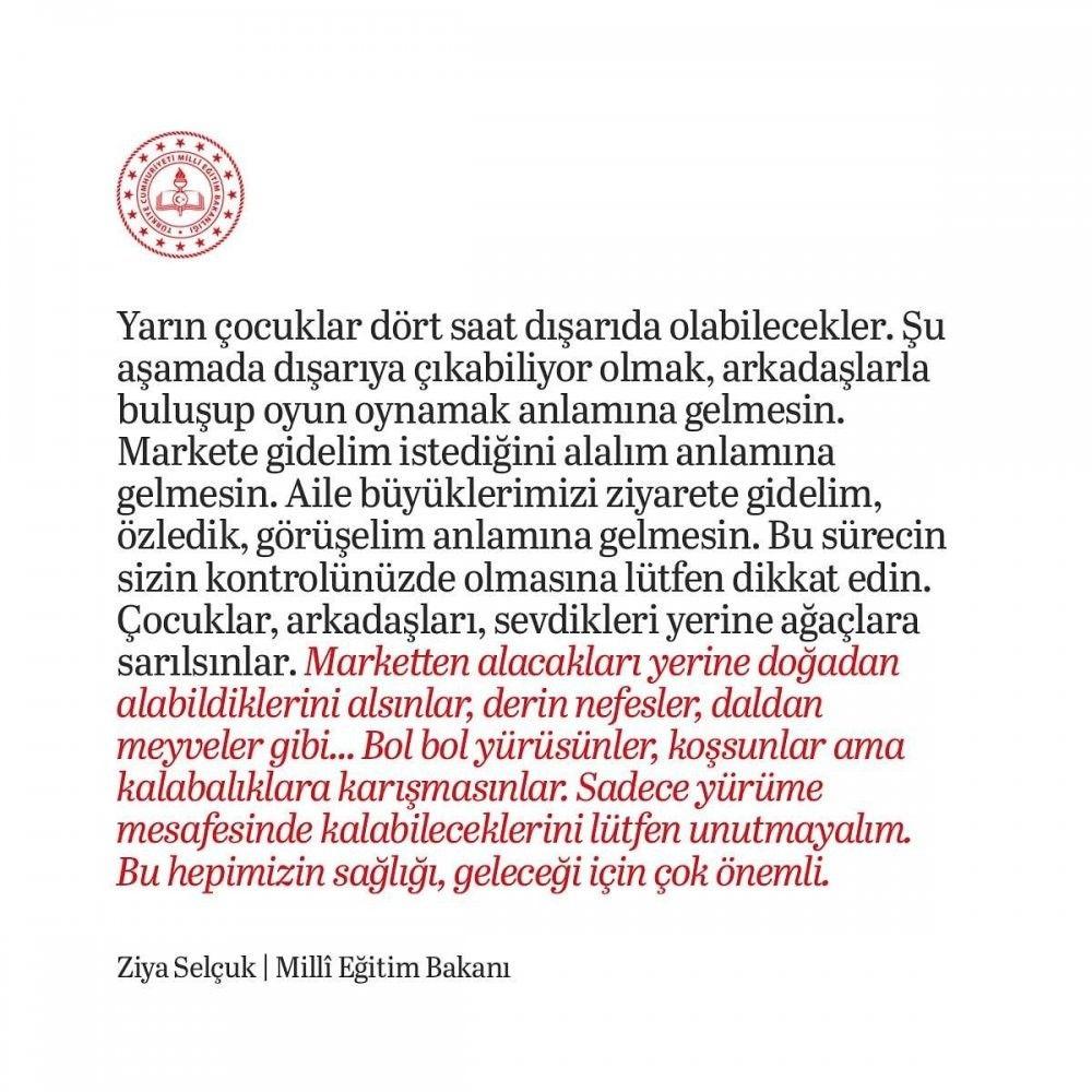 Milli Eğitim Bakanı Ziya Selçuk, 'Bu sürecin sizin kontrolünüzde olmasına lütfen dikkat edin. Çocuklar, arkadaşları, sevdikleri yerine ağaçlara sarılsınlar. Bol bol yürüsünler, konuşsunlar ama kalabalıklara karışmasınlar' dedi.