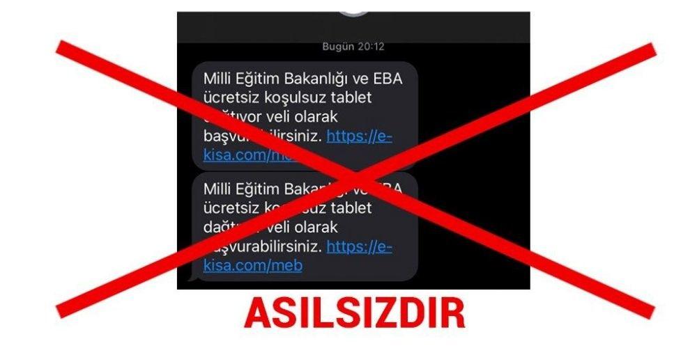 Milli Eğitim Bakanlığı, vatandaşları "Milli Eğitim Bakanlığı ve EBA ücretsiz, koşulsuz tablet dağıtıyor. Veli olarak başvuru için tıklayınız" şeklindeki sahte mesaj linklerine giriş yapmamaları konusunda uyardı.