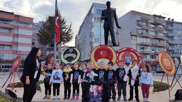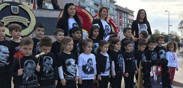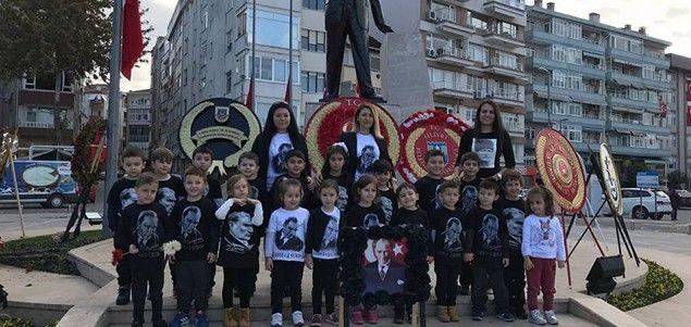 Renkli Balonlar Anaokulunun minik öğrencileri, Atatürk anıtı önünde düzenlenen 10 Kasım programına katıldı. Ellerindeki çiçekleri Atatürk'ün manevi huzuruna bırakan öğrenciler saygı duruşunda da bulundu.