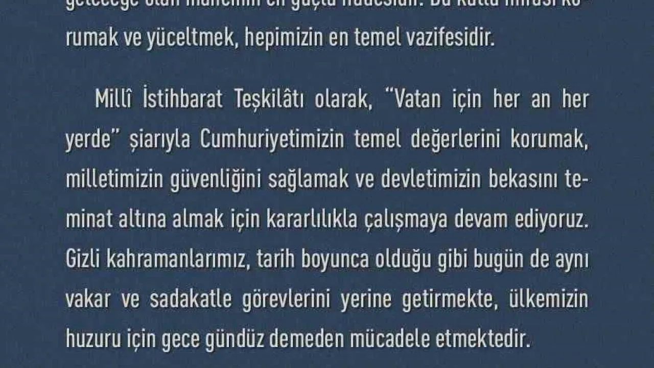 "Cumhuriyetimizin kuruluşunun 102. yıl dönümünü milletçe büyük bir gurur ve coşkuyla idrak ediyoruz. Cumhuriyet, aziz milletimizin bağımsızlık iradesinin ve ortak geleceğe olan inancının en güçlü ifadesidir. Bu kutlu mirası korumak ve yüceltmek, hepimizin en temel vazifesidir. Milli İstihbarat Teşkilatı olarak ‘Vatan için her an her yerde’ şiarıyla Cumhuriyetimizin temel değerlerini korumak, milletimizin güvenliğini sağlamak ve devletimizin bekasını teminat altına almak için kararlılıkla çalışmaya devam ediyoruz. Gizli kahramanlarımız, tarih boyunca olduğu gibi bugün de aynı vakar ve sadakatle görevlerini yerine getirmekte, ülkemizin huzuru için gece gündüz demeden mücadele etmektedir. Bu anlamlı günde başta Cumhuriyetimizin banisi Gazi Mustafa Kemal Atatürk ve silah arkadaşları olmak üzere tüm şehit ve gazilerimizi rahmet ve minnetle anıyor, aziz milletimizin Cumhuriyet Bayramı’nı en içten dileklerimle kutluyorum."