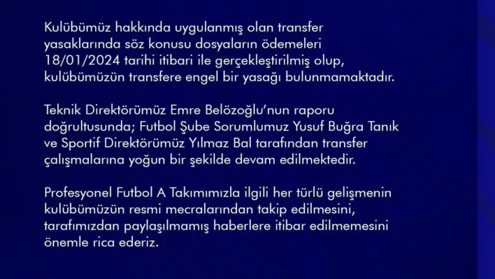 "Kulübümüz hakkında uygulanmış olan transfer yasaklarında söz konusu dosyaların ödemeleri 18/01/2024 tarihi itibari ile gerçekleştirilmiş olup, kulübümüzün transfere engel bir yasağı bulunmamaktadır. Teknik Direktörümüz Emre Belözoğlu’nun raporu doğrultusunda; Futbol Şube Sorumlumuz Yusuf Buğra Tanık ve Sportif Direktörümüz Yılmaz Bal tarafından transfer çalışmalarına yoğun bir şekilde devam edilmektedir. Profesyonel Futbol A Takımımızla ilgili her türlü gelişmenin kulübümüzün resmi mecralarından takip edilmesini, tarafımızdan paylaşılmamış haberlere itibar edilmemesini önemle rica ederiz."